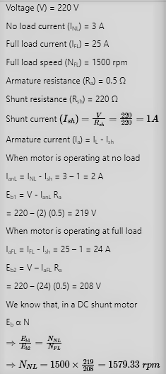 Q. A 220 V DC shunt motor takes 3 A at no-load. It draws 25 A when running at full-load at 1500 rpm. The armature and shunt resistances are 0.5 Ω and 220 Ω, respectively. The no- load speed in rpm (round off to two decimal places) is .