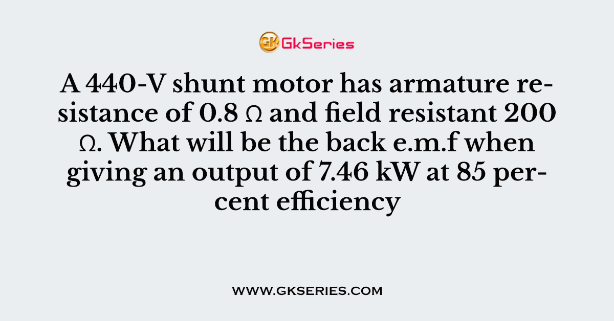 Q. A 440-V shunt motor has armature resistance of 0.8 Ω and field resistant 200 Ω. What will be the back e.m.f when giving an output of 7.46 kW at 85 percent efficiency.