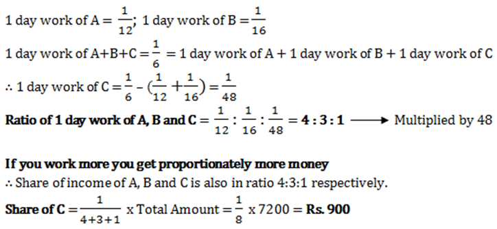 Home » quantitative aptitude » A and B took a job for Rs. 7200. A alone can do it in 12 days. B alone can do it in 16 days. They completed the work in 6 days with the help of C. Find the share of C.