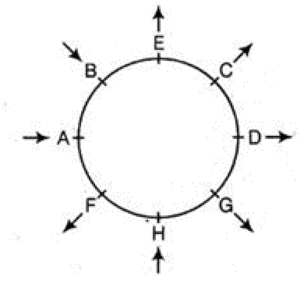 A, B, C, D, E, F, G and H are sitting around a circular area at equal distances between each other but not necessarily in the same order. Some of the people are facing the centre, while some face outside (i.e. in a direction opposite to the centre).
