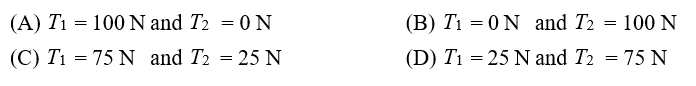 Ans: T1 = 0 N and T2 = 100 N