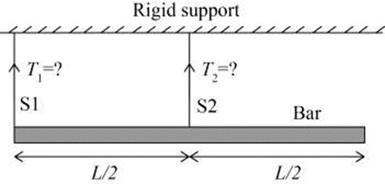 Q. A bar of uniform cross section and weighing 100 N is held horizontally using two massless and inextensible strings S1 and S2 as shown in the figure.