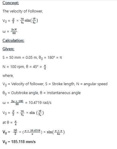 Q. A cam is designed to achieve a simple harmonic motion of a flat-faced follower. Starting from the rest, the follower rises to the maximum height of 50 mm at 180˚ of cam rotation as shown in the figure.