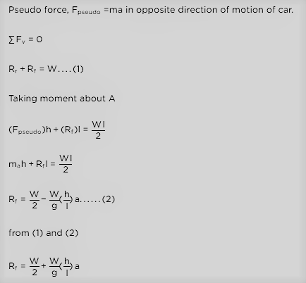 Q. A car having weight W is moving in the direction as shown in the figure. The center of gravity (CG) of the car is located at height h from the ground, midway between the front and rear wheels. The distance between the front and rear wheels is l. The acceleration of the car is a, and acceleration due to gravity is g. The reactions on the front wheels (Rf) and rear wheels (Rr) are given by