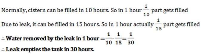 QuestionA cistern is normally filled with water in 10 hours but takes 5 hours longer to fill because of a leak in its bottom. If the cistern is full, the leak will empty the cistern in
