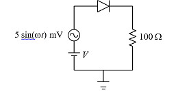 Q. A dc current of 26 μA flows through the circuit shown. The diode in the circuit is forward biased and it has an ideality factor of one. At the quiescent point, the diode has a junction capacitance of 0.5 nF . Its neutral region resistances can be neglected. Assume that the room temperature thermal equivalent voltage is 26 mV