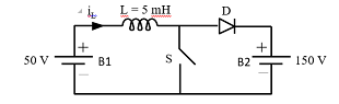 Q. A dc to dc converter shown in the figure is charging a battery bank, B2 whose voltage is constant at 150 V. B1 is another battery bank whose voltage is constant at 50 V. The value of the inductor, L is 5 mH and the ideal switch, S is operated with a switching frequency of 5 kHz with a duty ratio of 0.4. Once the circuit has attained steady state and assuming the diode D to be ideal, the power transferred from B1 to B2 (in Watt) is (up to 2 decimal places).