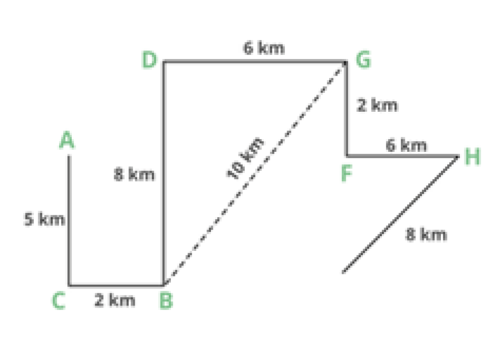 A is travelling towards the south to reach point C which is 5 km apart. He took left and travels 2 km to reach point B. From B, he takes 8 km to left and reaches D after taking right he reaches G, then takes again right from point G and travels 2 km to reach point F. From point F, he takes left turns and travels 6 km to reach point H. Now, from point H, he turns towards the right and travels 8 km by making a 45-degree angle to reach point E. A covers 6 km distance from point D to E.
