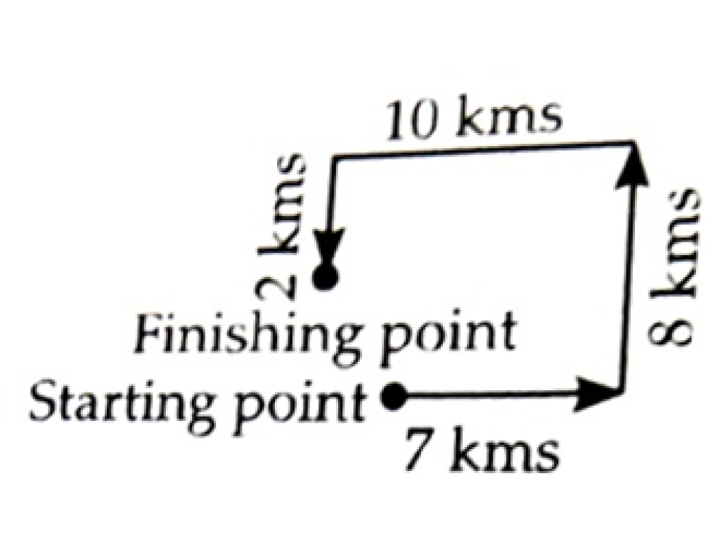 A man travels 7 kms towards East, then he turns left and travels 8 kms, again he turns left and travels 10 kms