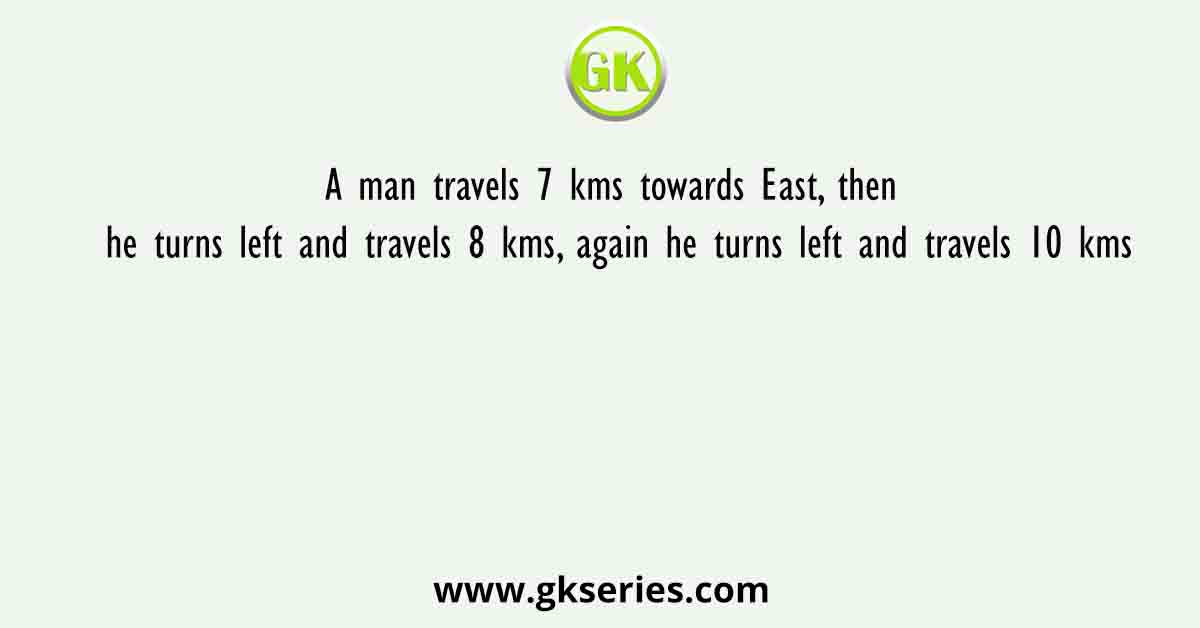 A man travels 7 kms towards East, then he turns left and travels 8 kms, again he turns left and travels 10 kms