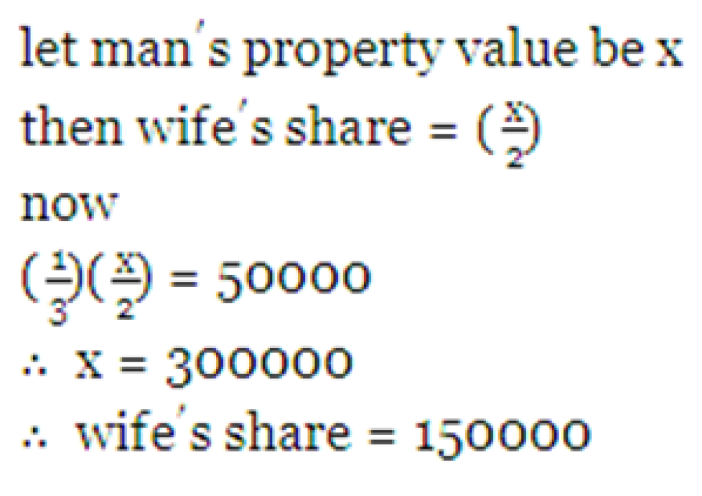 A man’s property was distributed among his wife and three sons. If the wife got half.the share and the remaining was distributed equally among his 3 children such that each child gets Rs 50, 000 what was the worth of the property and how much did the wife
