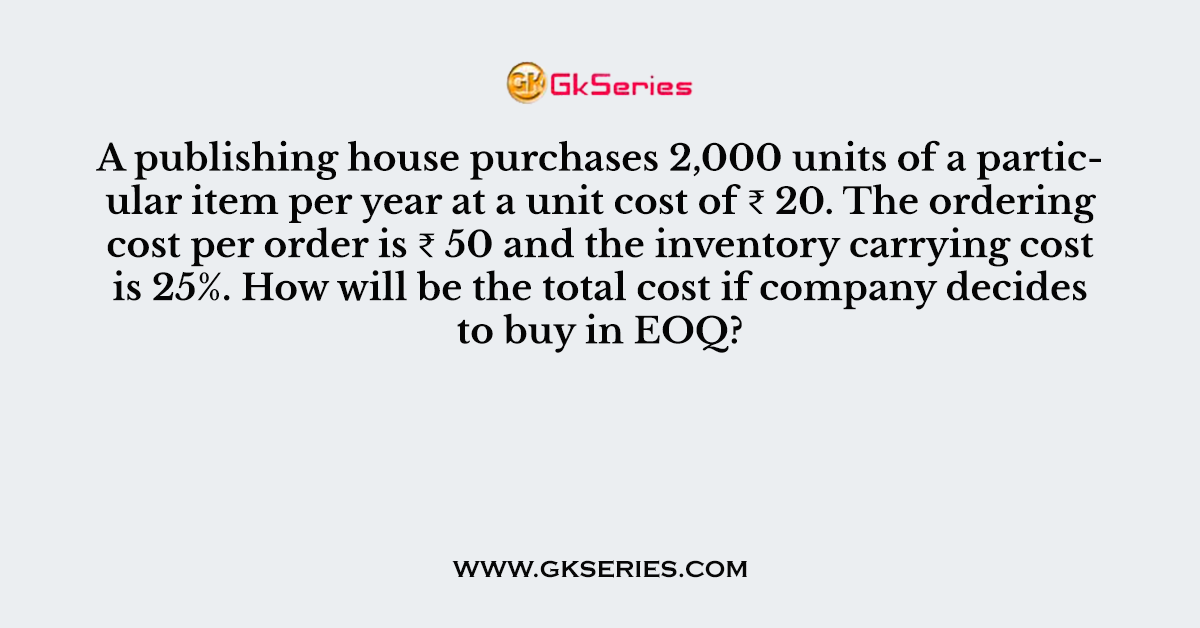 Q. A publishing house purchases 2,000 units of a particular item per year at a unit cost of ₹ 20. The ordering cost per order is ₹ 50 and the inventory carrying cost is 25%. How will be the total cost if company decides to buy in EOQ?