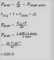 Q. A pulsed laser emits rectangular pulses of width 1 nanosecond at a repetition rate of 1 kHz. If the average power output is 1 mW, the average power over a single pulse duration, in watts, is