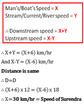 Home » quantitative aptitude » A river flows at speed of 6 km/hr. Surendra swims downstream for some distance in just 12 hours. But he takes 18 hours to return the same distance upstream. How fast is Surendra in still water?