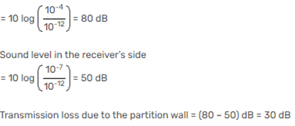 Home » gate questions » A room is separated by a partition wall. The average intensities of sound in the source and receiving sides across the partition are 10-4 W/m2 and 10-7 W/m2 respectively
