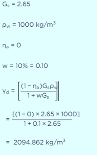 Home » gate questions » A soil has specific gravity of its solids equal to 2.65. The mass density of water is 1000 kg/m3. Considering zero air voids and 10% moisture content of the soil