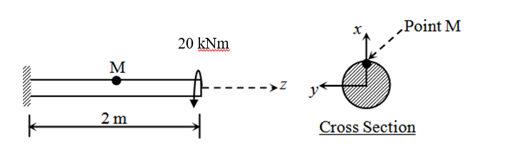 Q. A solid circular beam with radius of 0.25 m and length of 2 m is subjected to a twisting moment of 20 kNm about the z-axis at the free end, which is the only load acting as shown in the figure. The shear stress component 𝑟𝑥𝑦 at Point ‘M’ in the cross-section of the beam at a distance of 1 m from the fixed end is