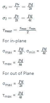 Note: We always consider maximum shear stress because it fails the system first and in the case of the cylinder out of plane shear stress is maximum that’s why we do not consider in-plane stress for calculation if nothing mention in the question. where, σc = Circumferential stress, σL = Longitudinal stress, P = Internal gauge pressure d = Inside diameter of the cylinder, t = thickness of the cylinder