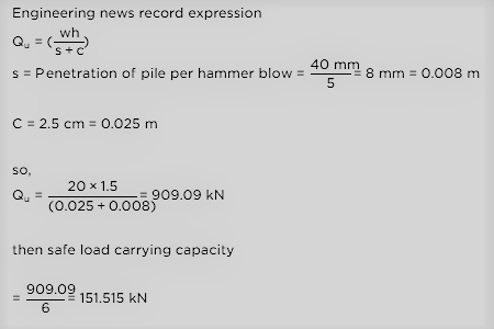 Q. A timber pile of length 8 m and diameter 0.2 m is driven with a 20 kN drop hammer, falling freely from a height of 1.5 m. The total penetration of the pile in the last 5 blows is 40 mm. Use the Engineering News Record expression. Assume a factor of safety of 6 and empirical factor (allowing reduction in the theoretical set, due to energy losses) of 2.5 cm. The safe load carrying capacity of the pile (in kN, round off to 2 decimal places) is
