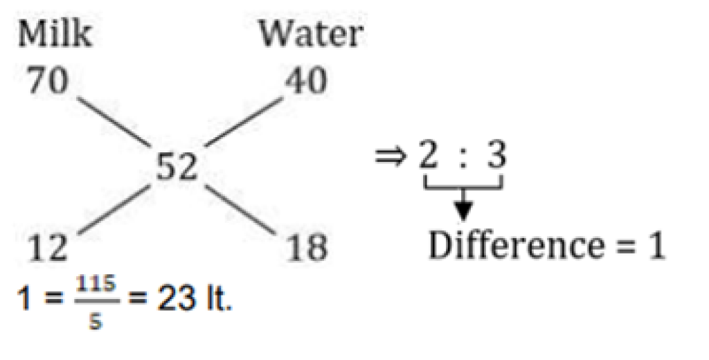 Home » quantitative aptitude » A vessel of 115 litres is filled with milk and water. 70% of milk and 40% of water is taken out of the vessel it is found that the vessel is
