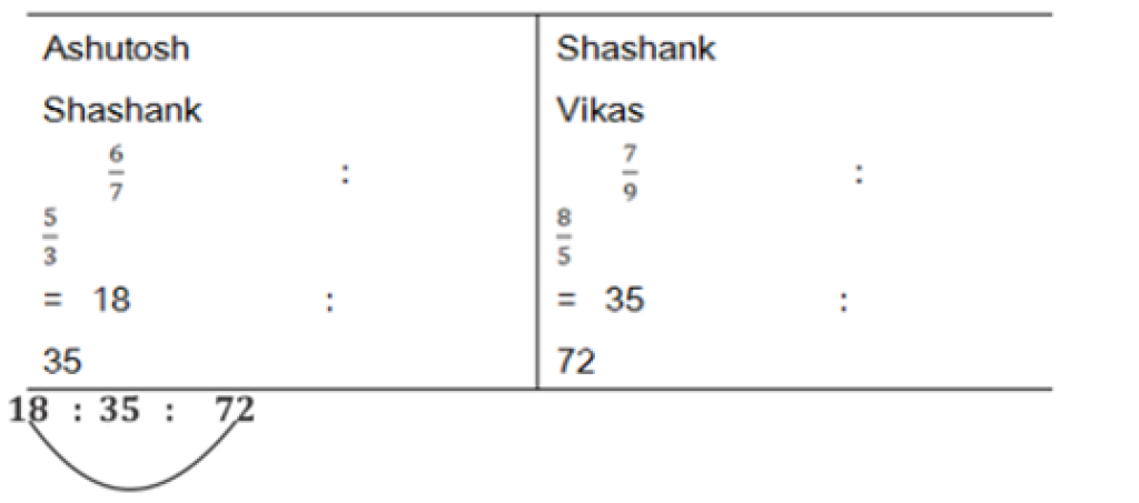 After the completion of a work, a sum was divided among Ashutosh, Shashank and Vikas such that the ratio of shares of Ashutosh and Shashank is 6/7:5/3 and that of Shashank & Vikas is 7/9:8/5. If the difference between the shares of Ashutosh and Vikas is Rs. 540, find the sum?