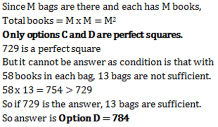 Home » quantitative aptitude » Ajay had some books in his library. He tried packing them in bags in various ways. While packing 85 books in each bag, 9 bags were not filled completely. Also, while packing 58 books in each bag, 13 bags were not enough to pack all the books. But in the end he was able to pack the books in M bags each having M books. How many books did Ajay have?