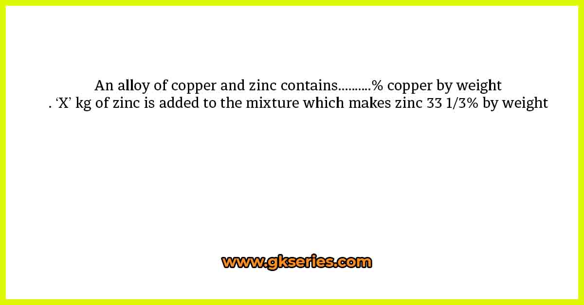 An alloy of copper and zinc contains……….% copper by weight. ‘X’ kg of zinc is added to the mixture which makes zinc 33 1/3% by weight