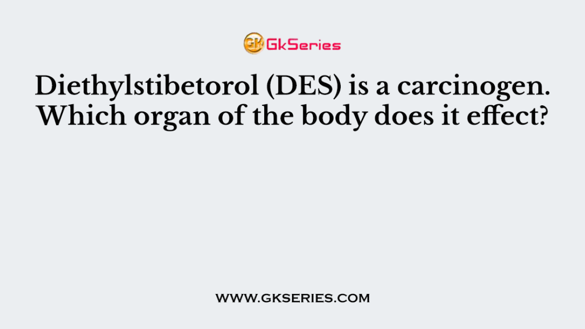 Diethylstibetorol (DES) is a carcinogen. Which organ of the body does it effect? HomeCancer MCQsDiethylstibetorol (DES) is a carcinogen. Which organ of the body does it effect?Q. Diethylstibetorol (DES) is a carcinogen. Which organ of the body does it effect?A. VaginaB. HeartC. LungD. KidneyAnswer: Vagina