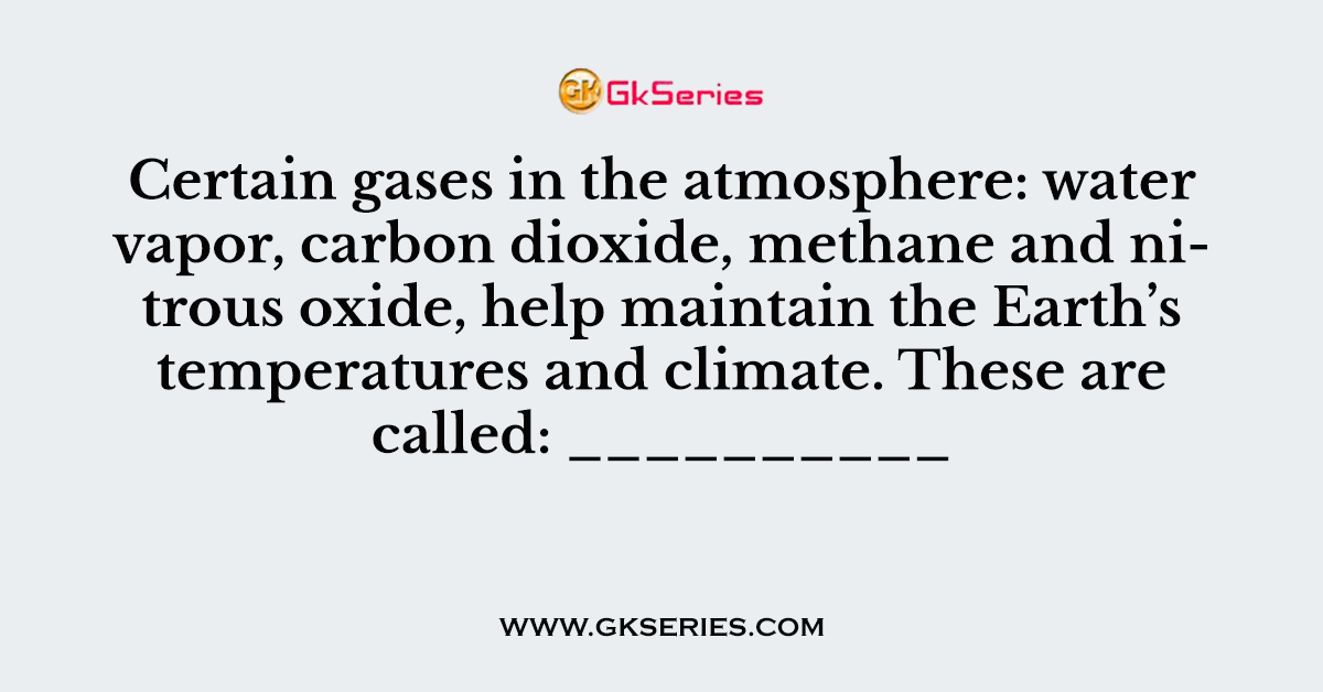 Q. Certain gases in the atmosphere: water vapor, carbon dioxide, methane and nitrous oxide, help maintain the Earth’s temperatures and climate. These are called: __________ .