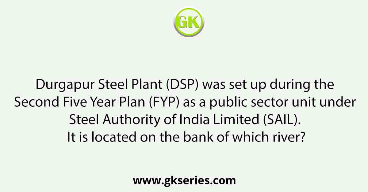 | Question | Durgapur Steel Plant (DSP) was set up during the Second Five Year Plan (FYP) as a public sector unit under Steel Authority of India Limited (SAIL). It is located on the bank of which river? | |