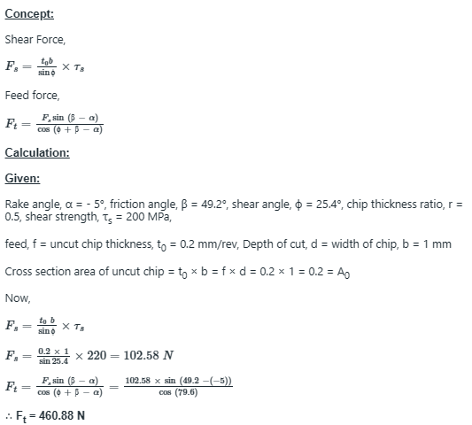 Given chip thickness ratio as 0.5, friction angle as 49.2˚ and shear angle as 25.4˚, the feed force (in N) is___________