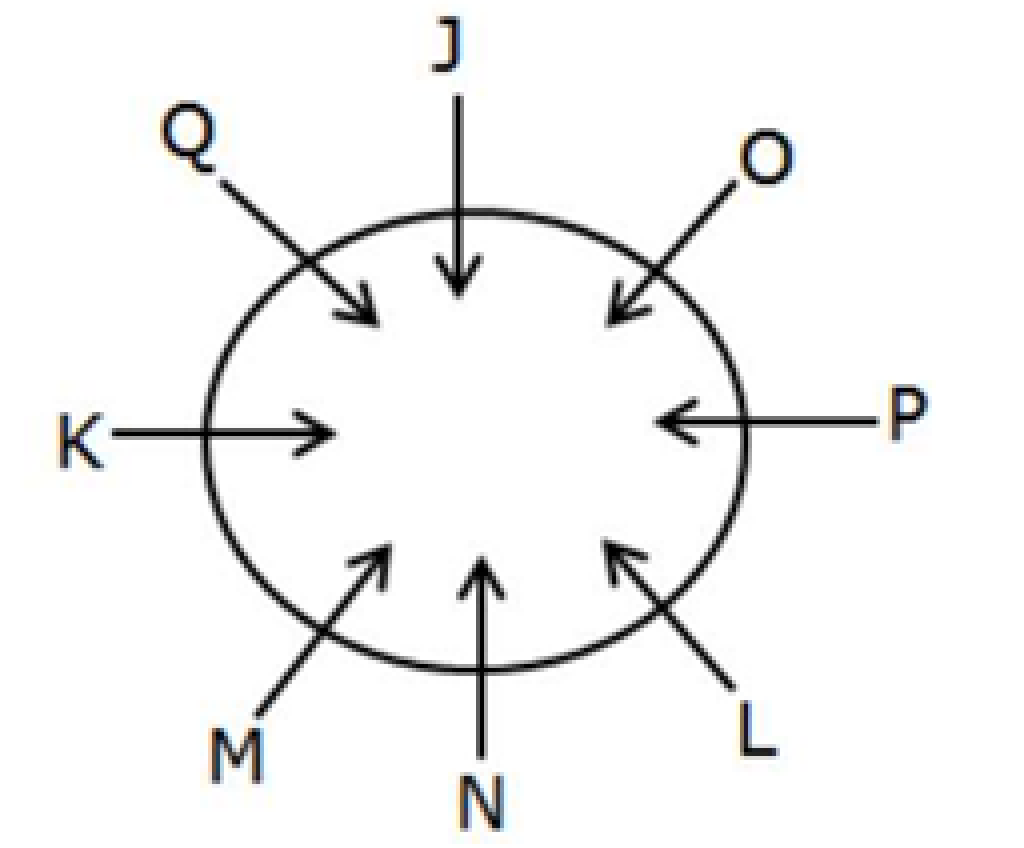 Eight persons- J, K, L, M, N, O, P and Q are sitting around a circular table facing the center but not necessarily in the same order. Only two persons sit between N and O (either from left or right). J sits immediate right of O. The one who sits third to the left of J faces Q. Two persons sit between Q and P. P does not face N. M does not sit adjacent to P. One person sits between M and L. Who among the following person sits immediate left of M?