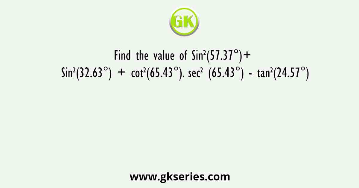 Find the value of Sin²(57.37°)+ Sin²(32.63°) + cot²(65.43°). sec² (65.43°) – tan²(24.57°)