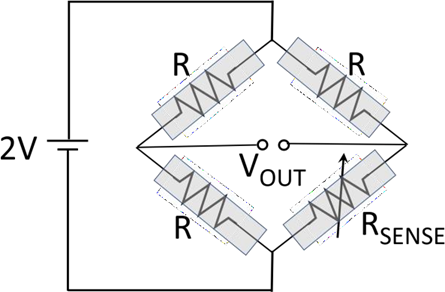 Q. Four identical resistive strain gauges with gauge factor of 2.0 are used in a Wheatstone bridge as shown in the figure below. Only one of the strain gauges 𝑅𝑆𝐸𝑁𝑆𝐸 changes its resistance due to strain. If the output voltage π‘‰π‘‚π‘ˆπ‘‡ is measured to be 1 mV, the magnitude of strain, in units of microstrain, is