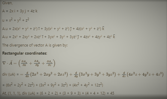Q. If 𝐀 = 2π‘₯𝐒 + 3𝑦𝐣 + 4𝑧𝐀  Β and 𝑒 = π‘₯2 + 𝑦2 + 𝑧2, then div(𝑒𝐀) at (1, 1, 1) is