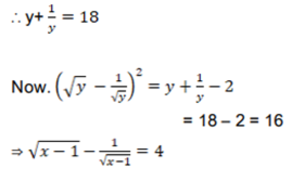 Home » quantitative aptitude » If x – 10 = 4 , then Quantitative aptitude If x – 10 = 4 , then April 9, 2024 11 Views If x – 10 = 4 , then (a) 4 (b) 5 (c) 2 √2 (d) 4 √2 Sol: Let y = x – 1 = 9 + 4 √5 and 1/y=1/x-1=9-4√5