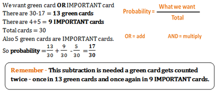 Home » quantitative aptitude » In a set of 30 game cards, 17 are white and rest are green. 4 white and 5 green are marked IMPORTANT. If a card is chosen randomly from this set, what is the possibility of choosing a green card or an ‘IMPORTANT’ card?