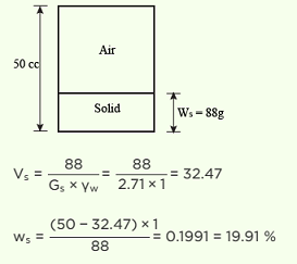 Q. In a shrinkage limit test, the volume and mass of a dry soil pat are found to be 50 cm3 and 88 g, respectively. The specific gravity of the soil solids is 2.71 and the density of water is 1 g/cc. The shrinkage limit (in %, up to two decimal places) is