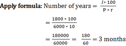 | Question | In how many years the simple interest on Rs. 6000 at 10% rate of interest S.I will become Rs. 1800? | |