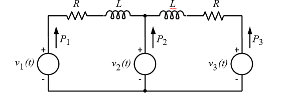 Q. In the figure, the voltages are 𝑣1(𝑡) = 100cos(𝜔𝑡), 𝑣2(𝑡) = 100cos(𝜔𝑡 + 𝜋/18) and 𝑣3(𝑡) = 100cos(𝜔𝑡 + 𝜋/36). The circuit is in sinusoidal steady state, and 𝑅 << 𝜔𝐿. 𝑃1, 𝑃2 and 𝑃3 are the average power outputs. Which one of the following statements is true?