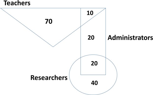 Q. In the given diagram, teachers are represented in the triangle, researchers in the circle and administrators in the rectangle. Out of the total number of the people, the percentage of administrators shall be in the range of