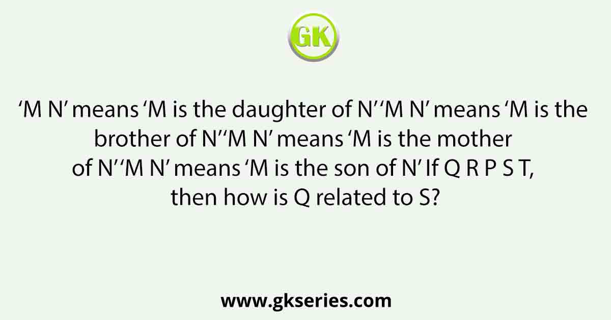 ‘M N’ means ‘M is the daughter of N’ ‘M N’ means ‘M is the brother of N’‘M N’ means ‘M is the mother of N’ ‘M N’ means ‘M is the son of N’ If Q R P S T, then how is Q related to S?