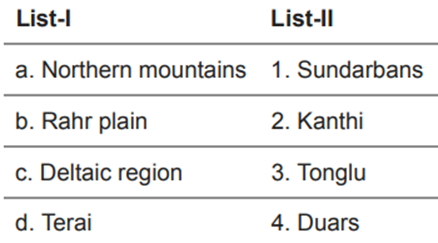 Home » west bengal gk » Match the following West Bengal GK Match the following May 25, 2023 4 Views 1. a-1, b-2, c-3, d-42. a-2, b-3, c-4, d-13. a-4, b-1, c-2, d-34. a-3, b-2, c-1, d-4