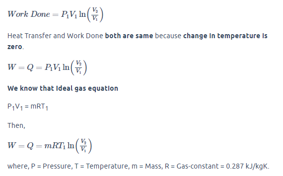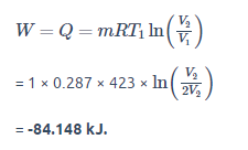 m = 1 kg, T1 = T2 = 150°C = 423 K (Isothermal Process), V1 = 2V2, R = 0.287 kJ/kgK