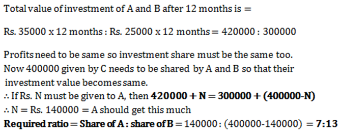 P and Q invested in a hotel with Rs. 35000 and Rs. 25000 respectively. R comes along and puts a condition that each must share the profit equally. To do so, he gives Rs. 400000 to P and Q to share between them. In what ratio do A and B respectively share the money given by C?