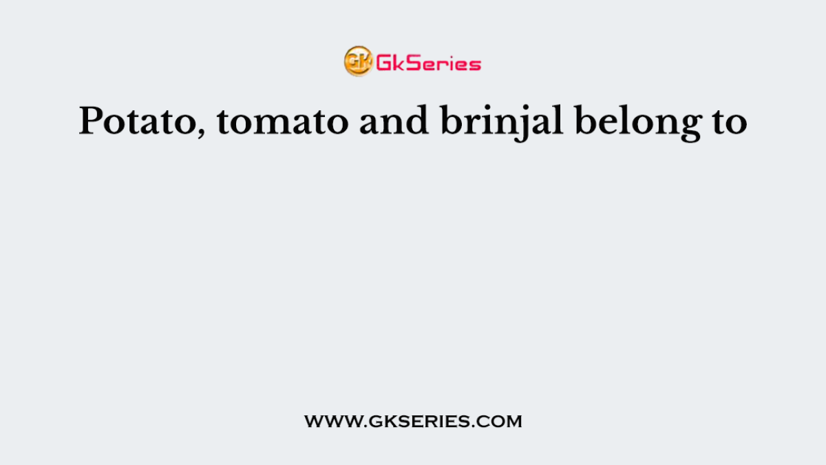 Potato, tomato and brinjal belong to HomeAngiosperms MCQsPotato, tomato and brinjal belong toQ. Potato, tomato and brinjal belong toBrassicaceaeMalvaceaeSolanaceaeLiliaceaeAnswer: Solanaceae