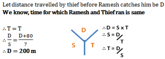 Home » quantitative aptitude » Ramesh sees a thief at a distance of 80 m. Ramesh starts chasing the thief who is running at a speed of 5 m/s. Ramesh is chasing him with a speed of 7 m/s. How much distance does the thief covers before Ramesh catches him?