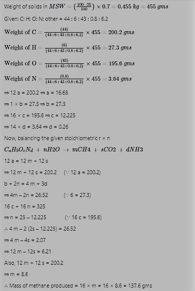Q. Raw municipal solid waste (MSW) collected from a city contains 70% decomposable material that can be converted to methane. The water content of the decomposable material is 35%. An elemental analysis of the decomposable material yields the following mass percent.