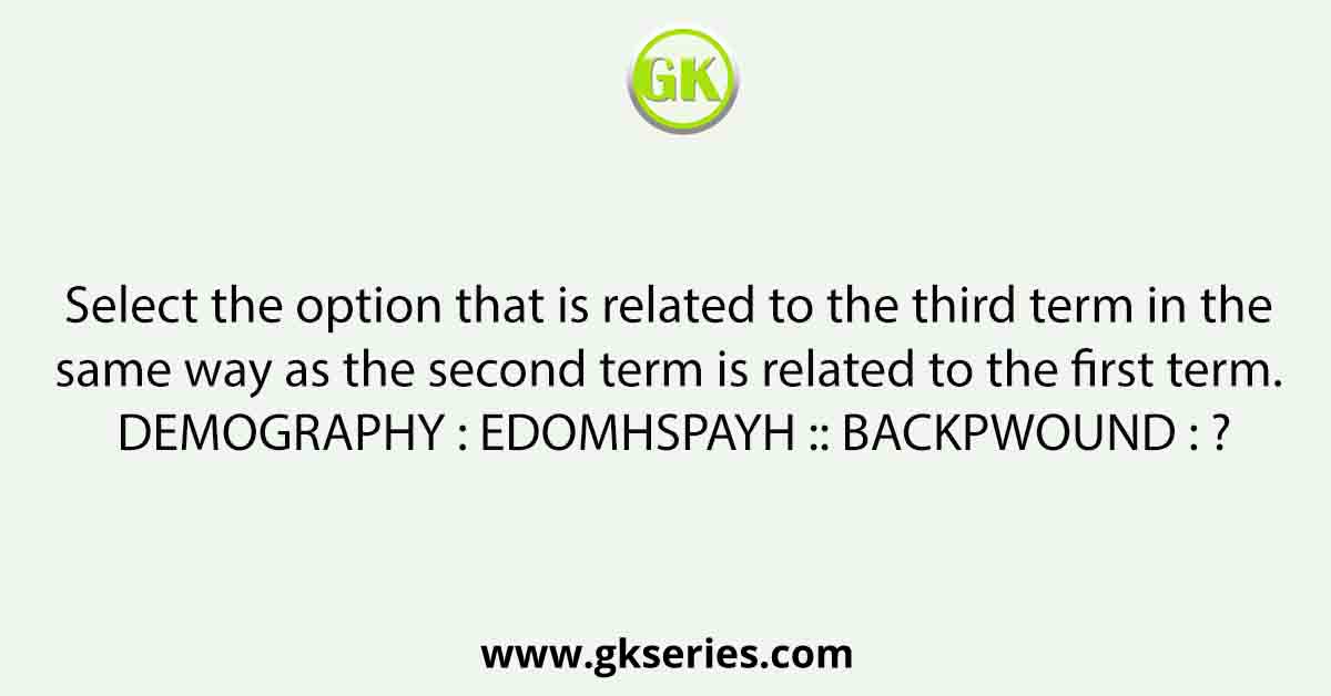 | Question | Select the option that is related to the third term in the same way as the second term is related to the first term. DEMOGRAPHY : EDOMHSPAYH :: BACKPWOUND : ? | |