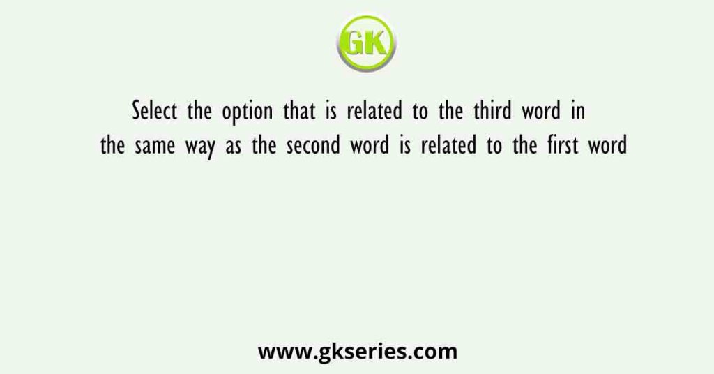 Select the option that is related to the third word in the same way as the second word is related to the first word. (The words must be considered as meaningful English words and must not b e related to each other based on the number of letters/number of consonants/vowels in the word.)